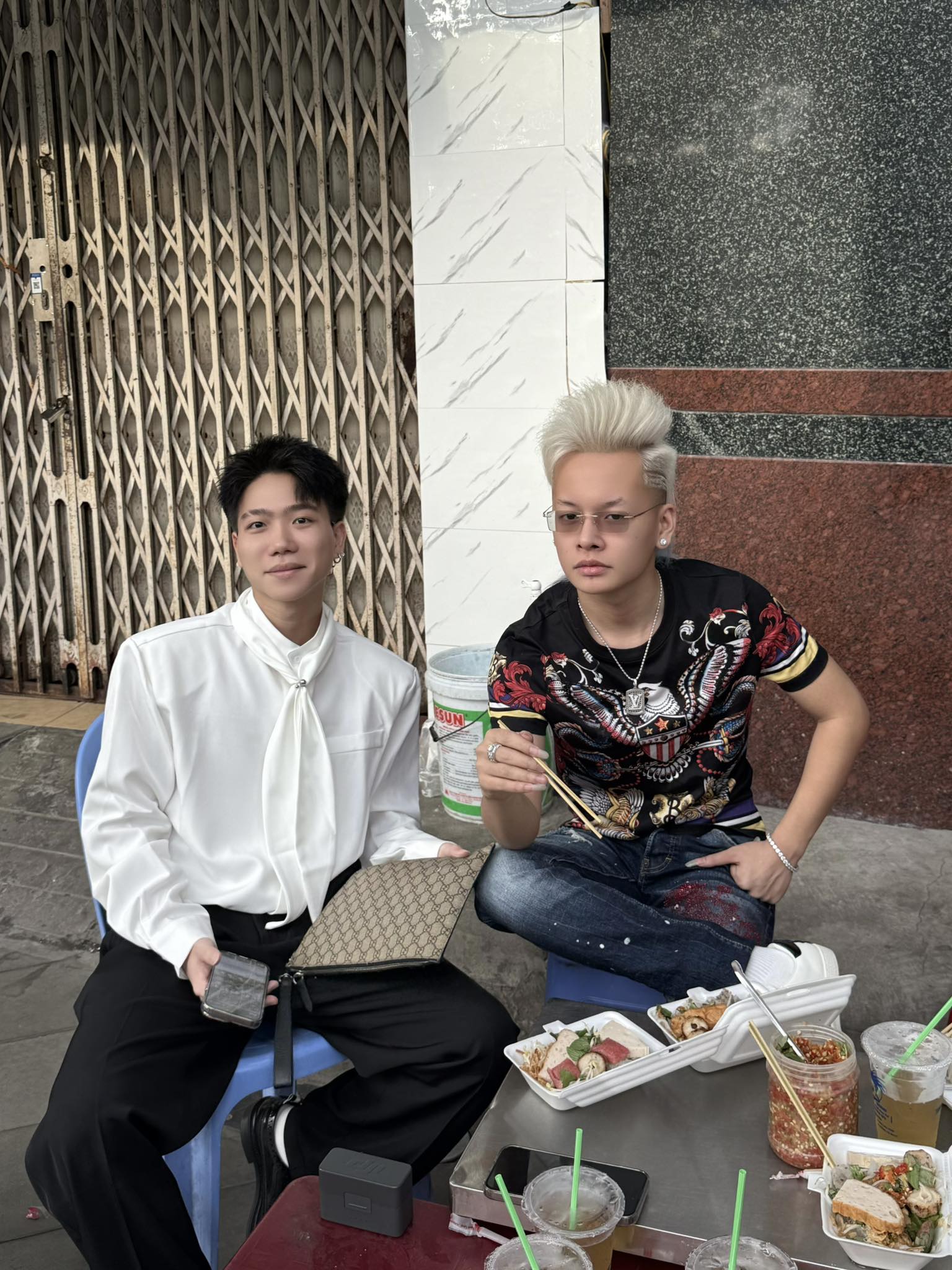 The photo shows two young men sitting on small plastic stools at a street-side food spot. The person on the left is wearing a white shirt with a loose necktie-style detail, holding a phone and a patterned clutch bag. The person on the right has light blond hair, wears a colorful graphic T-shirt and jeans, and is using chopsticks while looking toward the camera. In front of them is a low metal table filled with street food dishes and iced drinks. The background features a metal gate and tiled walls, giving the scene a casual urban feel.